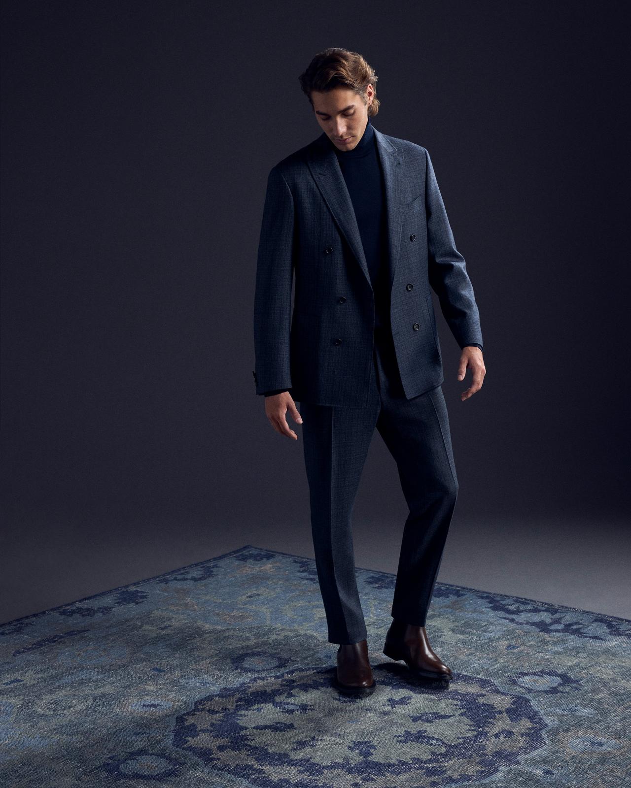 Here, Canali’s distinguished KEI tailoring model is interpreted in double-breasted form complete with classic wide lapels, a style typical of the art déco period and one that has been celebrated on a mass scale in recent years. A man is perhaps at his most distinguished wearing a double-breasted suit, and when paired with a handsomely form-fitting knitted turtleneck sweater, he is dressed to his elegant best.