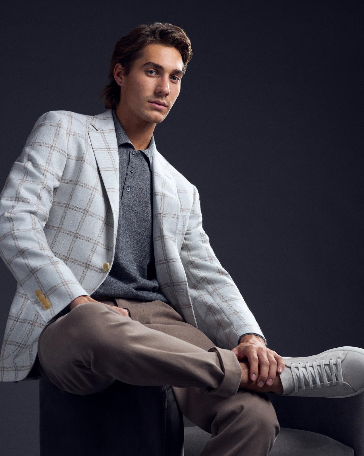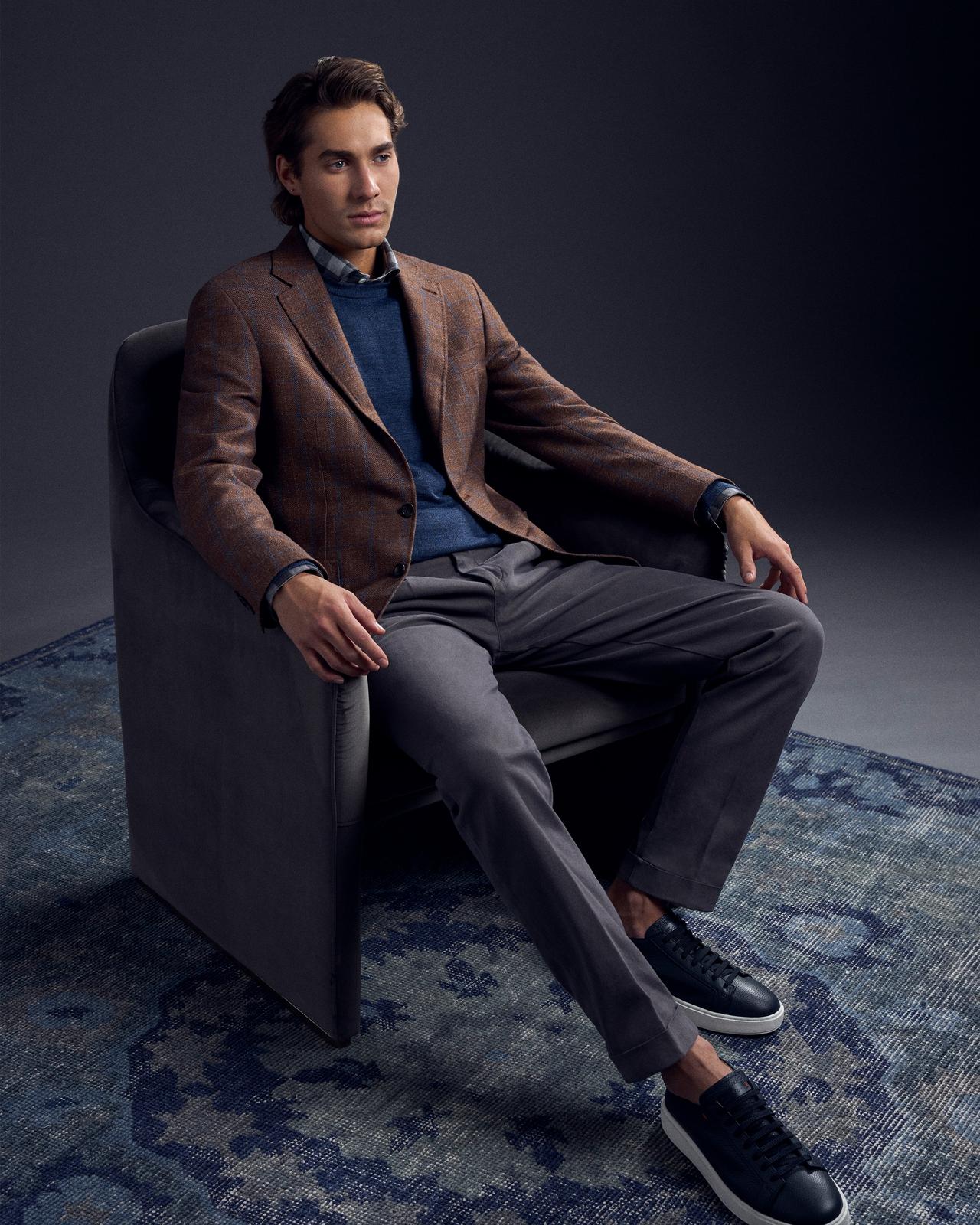 Some jackets were made for business; others, for pleasure – as is the case with this patterned cashmere example. A neat windowpane expression provides visual interest against a pair of pleated cotton trousers, with a simple piece of knitwear worn in lieu of a classic shirt.