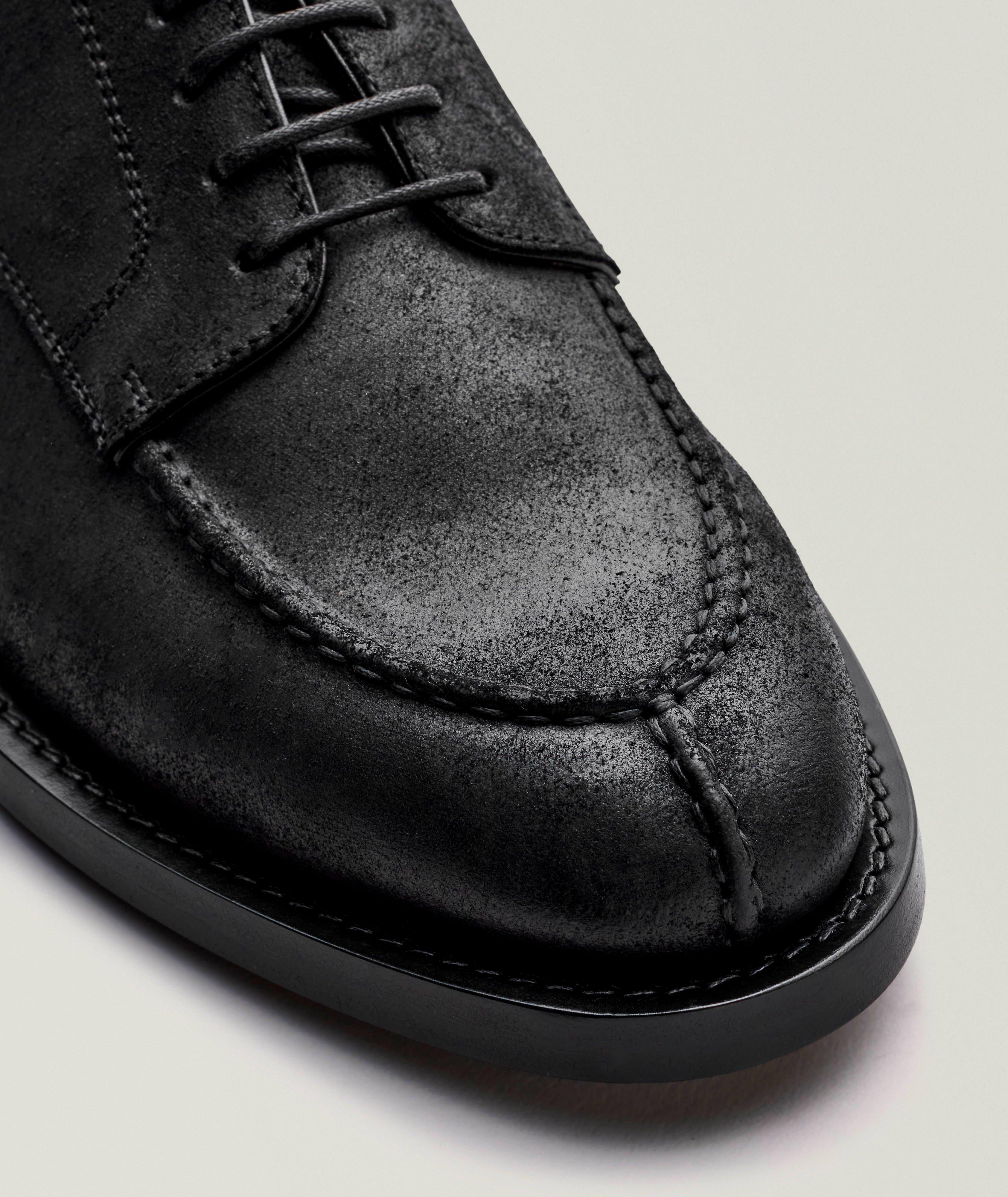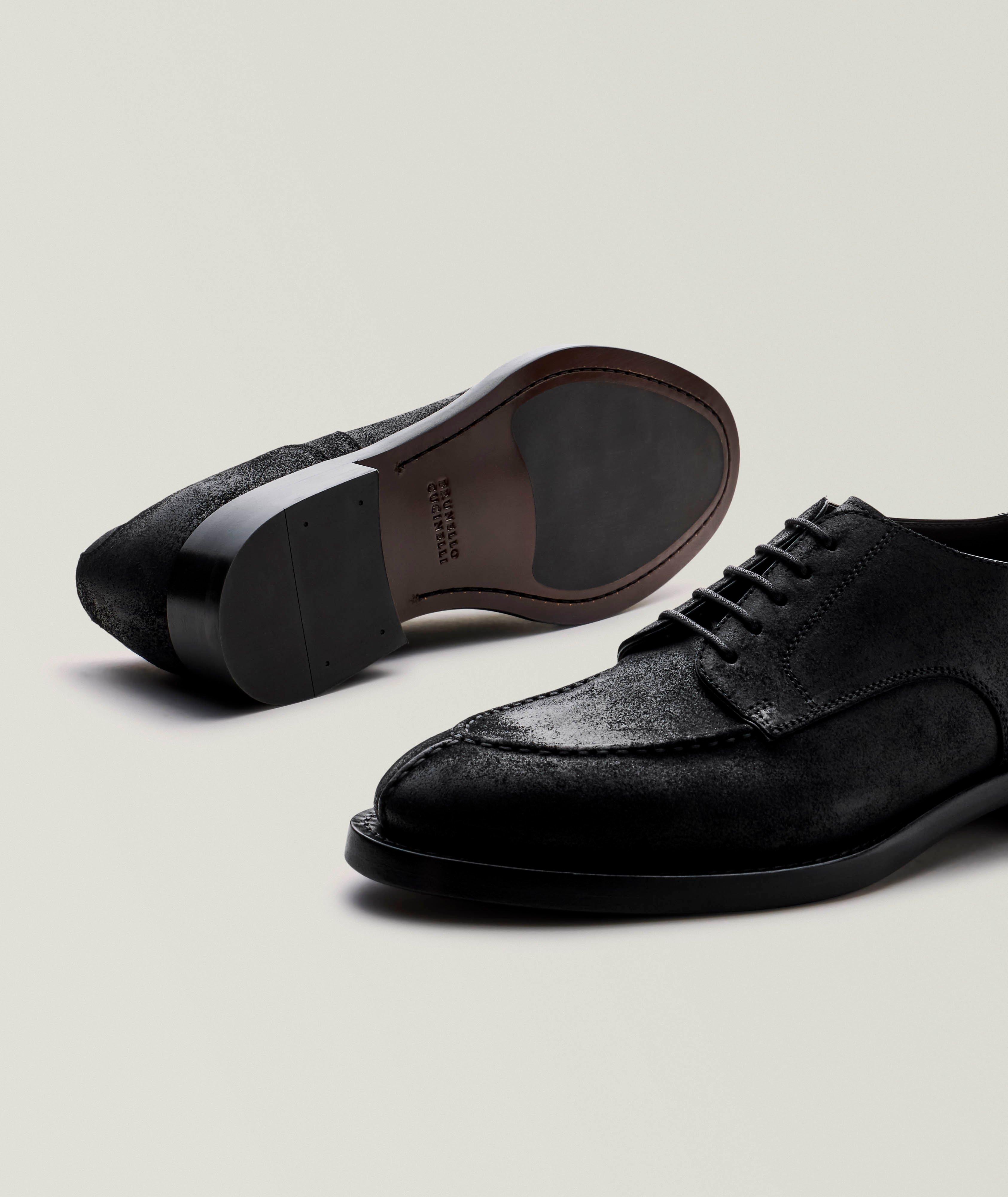 - The timeless allure of this refined derby is updated with a raised apron and split toe design. The oiled suede finish offers a streaked effect and velvety texture for effortless styling options.