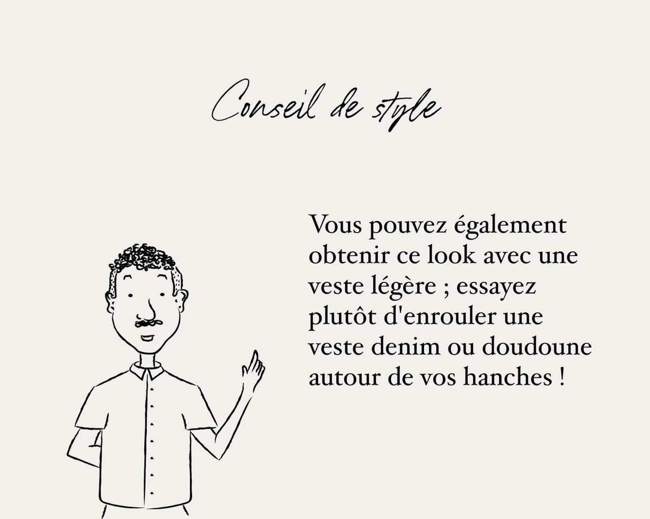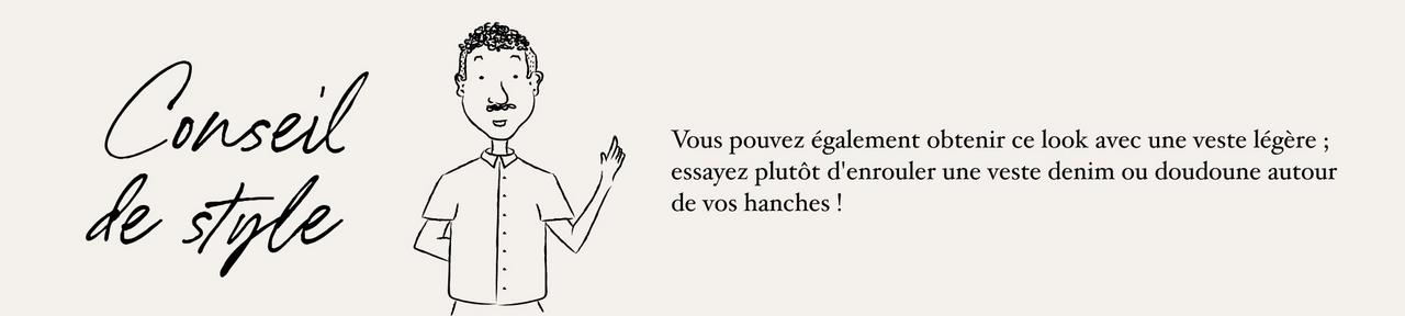 Parfois, un pull n’est pas destiné à être porté sur le haut du corps — voici la ceinture pull. Prenez les manches et enroulez-les autour de votre taille de l'arrière vers l'avant, puis nouez-les simplement sur le devant ou sur le côté.