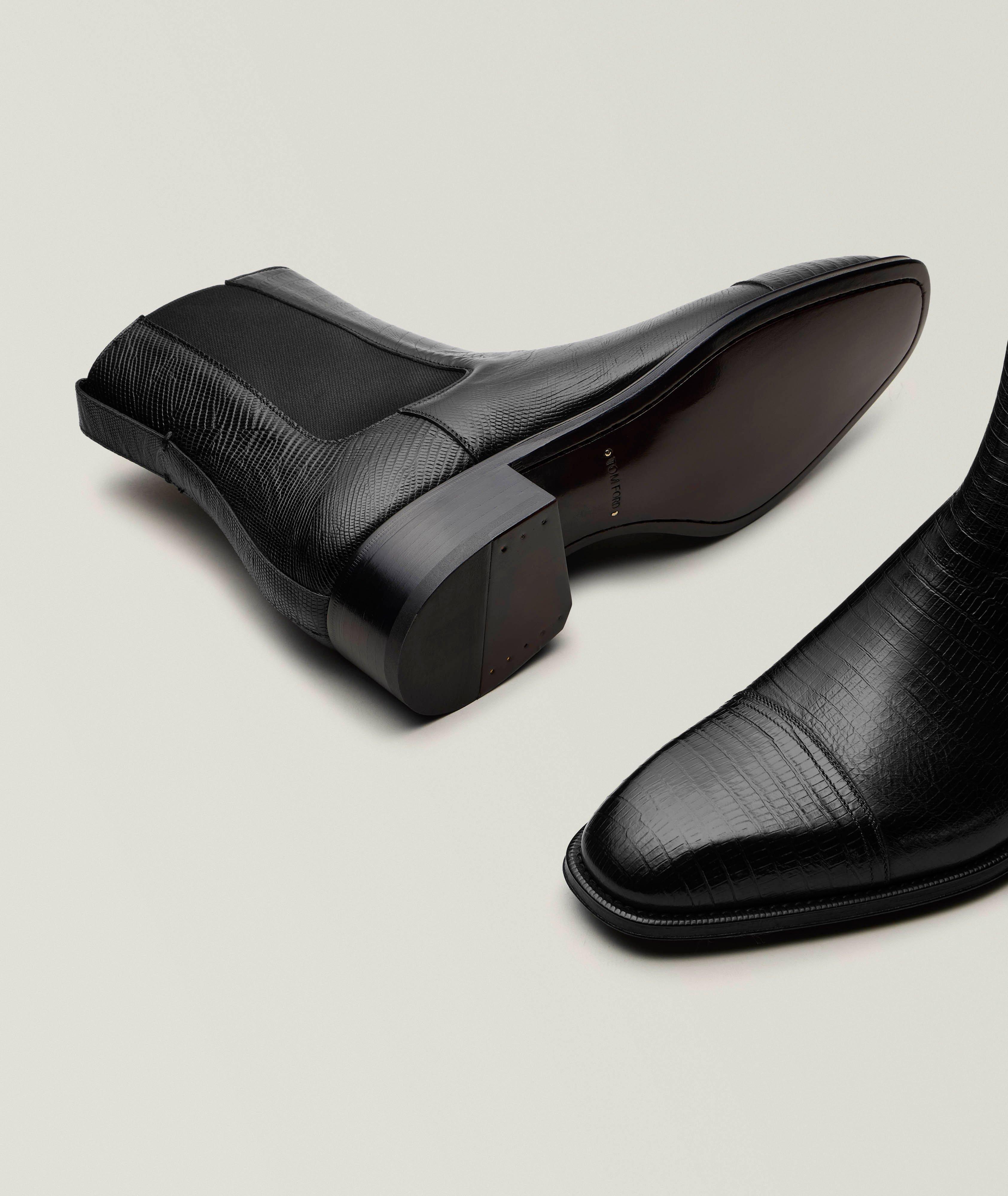 - Cette botte fabriquée en Italie incarne l’élégance moderne, tout en s’inspirant des modèles classiques et intemporels. Le cuir à motif d’écailles trouve aussi bien sa place dans une tenue chic que dans un ensemble plus décontracté du vendredi.