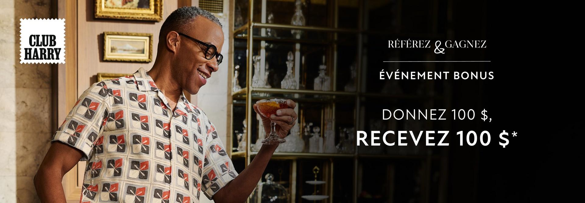 Offrez à vos amis 100 $ de rabais sur leur premier achat de 250 $ ou plus lorsqu'ils adhèrent au CLUB HARRY.